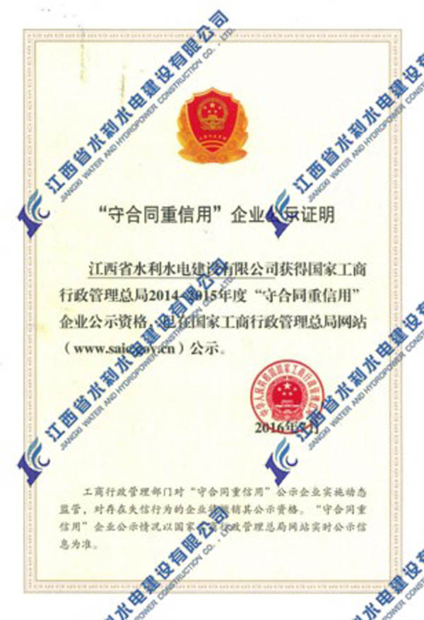 2016年我公司首次榮獲國(guó)家工商行政管理總局2014-2015年度“守合同重信用”企業(yè)公示資格。“守合同重信用”公示活動(dòng),是工商部門依托合同行政監(jiān)管職能組織開展的旨在推進(jìn)企業(yè)信用建設(shè)的“守重”企業(yè)公示活動(dòng),是長(zhǎng)期以來我國(guó)社會(huì)信用體系建設(shè)的重要組成部分。