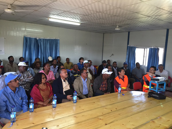 部長(zhǎng)一行于上午10時(shí)許抵達(dá)后,在我項(xiàng)目部主營(yíng)地召開(kāi)了現(xiàn)場(chǎng)會(huì)議,埃塞公司副總經(jīng)理兼項(xiàng)目經(jīng)理黃生寶詳細(xì)的介紹了項(xiàng)目的進(jìn)展情況及六大施工管理區(qū)的實(shí)施情況。并表示,盡管面臨著工期縮短、征地困難等諸多阻礙,我司一定會(huì)團(tuán)結(jié)各方、迎難而上,完成施工任務(wù)為埃塞水利發(fā)展貢獻(xiàn)力量。