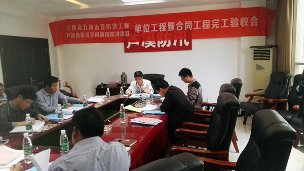 2017年4月19日蘆溪縣五河治理防洪工程項目部在蘆溪縣主持召開了江西省五河治理防洪工程蘆溪縣袁河宣風鎮段防洪項目單位工程暨合同工程完工驗收會議。蘆溪縣五河治理防洪工程項目部、江西省水利規劃設計研究院、江西省建洪工程監理咨詢有限公司、江西省水利水電建設有限公司、蘆溪縣宣風鎮鎮人民政府和銀河鎮人民政府等單位代表參加了本次驗收會議,并成立了單位工程暨合同工程完工驗收工作組,萍鄉市水工程建設監督管理站列席了本次會議。