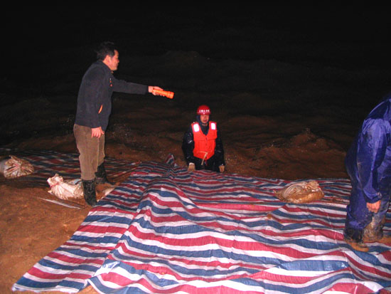 一到工地,總經理王元旦先對整個堤段進行了踏勘。由于近日南昌連降暴雨,贛江水位突然增高,再加上風高浪大,江水對堤岸的沖刷十分嚴重,導致楊子洲大堤幾處出現了滑坡現象,出現險情。隨后在當地區政府的召集下,業主、監理、施工方三方召開了一個簡短的碰頭會議,各單位分頭行動,各行其責。我公司作為施工方,首當其沖走在抗洪搶險第一線,一場硬仗拉開了序幕。