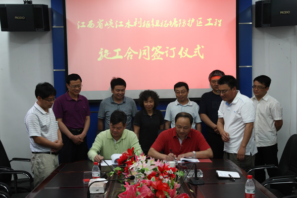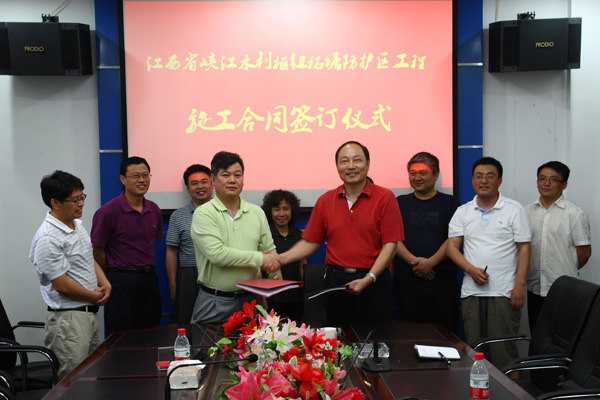 公司董事長總經理王元旦與峽江水利樞紐總指揮吳義泉簽訂施工合同