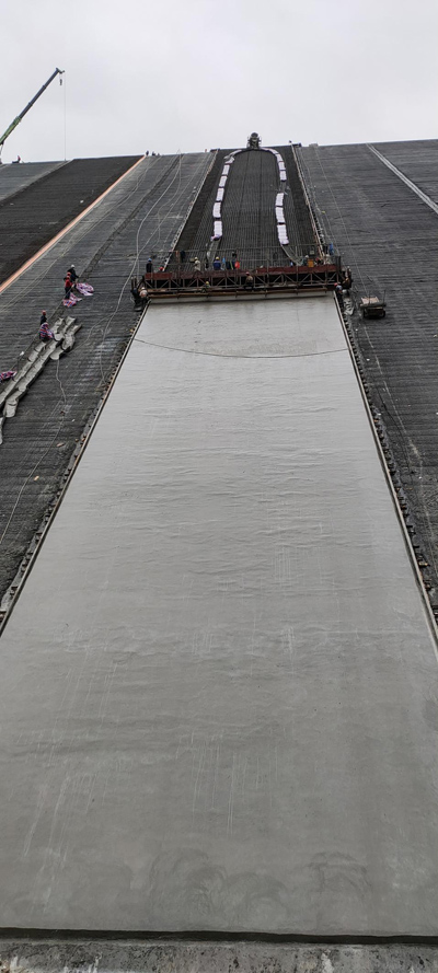 該工程是一座混凝土面板堆石壩,壩高78m,混凝土面板采用C25(W8、F100)混凝土,頂部厚度0.30m,底部最大厚度0.556m。面板混凝土采用滑動模板施工。工程量:C25(W8、F100)混凝土7657m3,鋼筋624t。