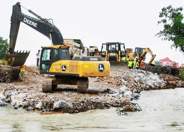 7月14日14時,封堵作業正式啟動,南北兩岸同時進占施工。然而,困難層出不窮:道路不平,存在積水,影響車輛通行;一線搶險人員的生活保障還不夠完善,吃住條件艱苦,防雨防曬防蚊設施簡陋,無便攜照明設施;砂石骨料耗量巨大,但存在配額限制,獲取來源較少。但現場人員攻堅克難,積極與政府、當地及偏遠廠商溝通,解決了人員基本需求和石料問題,并在當日順利鋪石20米,邁上堅實的第一步。