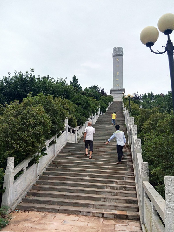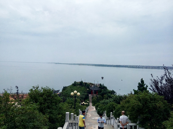 除了饒娥像,其對面的斗笠山也是美景所在之處。入山前,首先看到的是一條由青石板鋪成的臺階,臺階蜿蜒陡峭,兩側是漢白玉雕欄,欄上雕龍繪鳳,栩栩如生。抬頭仰望,只見臺階盡頭是一座高聳的石碑,燙金而書“天下第一碑”幾個大字。一路走走停停到了石碑前,眼前豁然開朗,放眼瞭望,到處一片茫茫水面,碧波蕩漾,翻起碎玉點點。窮極目力,水天一線之間,一座三角錐狀燈塔若隱若現,“浩渺鄱湖水接天,波翻浪涌競爭先;連江通海胸懷廣,滋養生靈歲復年。”余老的《鄱陽頌》誠不欺我。臺階中央又有一小平臺,連接至一片紅墻黃瓦的走廊,廊前紅墻上鑲嵌著墨色的石板,上面刻著一些當代大家對鄱陽湖的見聞和贊譽,筆走龍蛇,字體蒼勁,令人賞心悅目之時不免肅然起敬。走下斗笠山,已經接近傍晚,金日西斜,站在饒娥像后眺望,湖面一片金鱗銀濤,美如油畫。